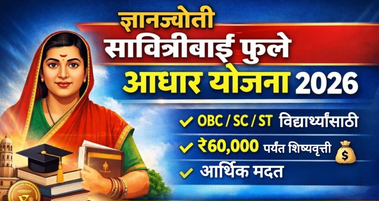 ज्ञानज्योती सावित्रीबाई फुले आधार योजना 2026 — एक सरकारी शिष्यवृत्ती / आर्थिक सहाय्यता योजना (महाराष्ट्र सरकार)ज्ञानज्योती सावित्रीबाई फुले आधार योजना महत्त्वाची विद्यार्थी योजना आहे जी महाराष्ट्र राज्य सरकार द्वारे चालवली जाते आणि 2024–25 हून सुरू आहे — आणि 2026 मध्येही यासाठी अर्ज/बनेफिट्स चालू आहेत.हे विशेषतः उच्च शिक्षण घेत असलेल्या मागास वर्गीय (OBC/VJNT/SBC/SC/ST) विद्यार्थ्यांना शैक्षणिक व…